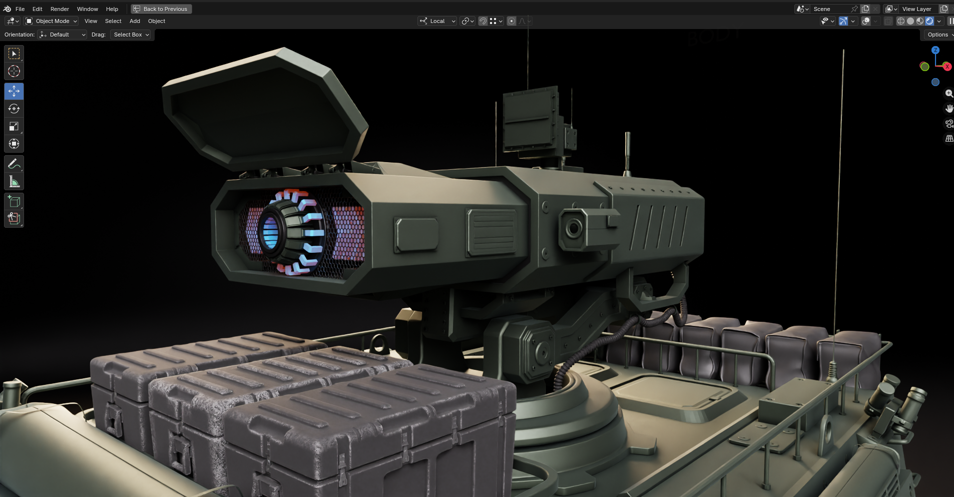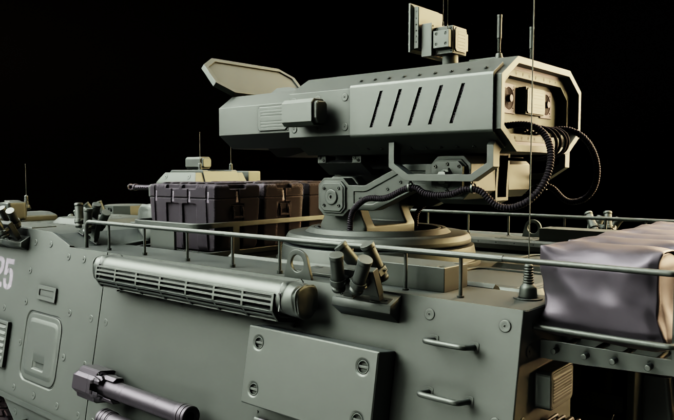 The APC was designed for a human resistance operating in a near-future conflict against autonomous machines. It features an EMP-based weapon system intended specifically to disable robotic targets rather than engage in conventional firepower. The design is grounded in modern military engineering, prioritizing crew protection, mobility in damaged environments, and tactical flexibility. The model was created as a story-driven, production-ready asset prepared for animation and further use in film or games.